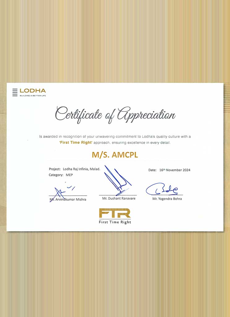 Abhishek Millennium Contracts Pvt Ltd.(AMCPL) is a well-established construction / contracting company involved in providing a full range of Engineering and Construction activities related to Water Supply / Plumbing and Firefighting / Detection systems in Residential and Commercial Projects by formulating concepts into reality and by highlighting long term objectives, safety, progress and cost-effectiveness, to achieve continual improvements.